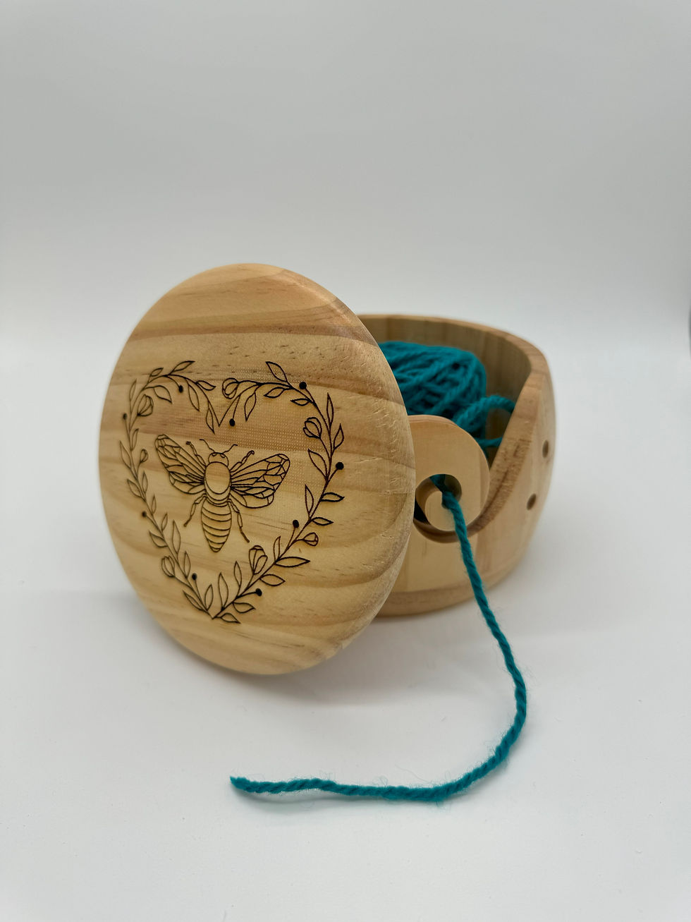 Yarn Holder Bowl with the Engraved Lid, BEE Wood, 5.5" Diameter 3.5" Heigh